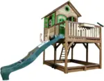 Auf dem Spielturm aus Holz in Braun und Grün warten jeden Tag neue Abenteuer auf Ihre großen und kleinen Entdecker. Ob das raue Leben auf hoher See als humpelnder Pirat oder ein Dschungel-Abenteuer mit wilden Tigern - die vielen Möglichkeiten auf dem ca. 377 x 291 x 255 cm (B x H x T) großen Spielturm laden zum Entdecken und austoben ein. Über die Leiter gelangen die Racker auf die Veranda, und überblicken das gesamte Königreich bevor es durch die Eingangstür in das Innere des Spielhauses geht. Hier sorgen 3 Fenster für Helligkeit und Behaglichkeit. Und wo schmecken Snacks und Eis besser als im eigenen Hauptquartier? Nach einer kurzen Stärkung, sausen die Entdecker und Abenteurer die grüne Rutsche aus Kunststoff hinunter in den Außenbereich. Dort warten die Blumen im Blumenkasten auf frisches Wasser und aufmunternde Worte. In der überdachten Sandkiste können Sandburgen und Gräben gebaut und der Kreativität freien Lauf gelassen werden. Dieser Artikel wird in unseren Filialen nicht ausgestellt, ist dort aber problemlos bestellbar. Bitte beachten Sie, dass abgebildete Dekoration im Lieferumfang nicht enthalten ist.